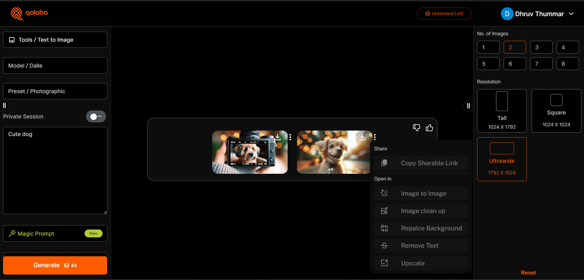 After generating the images, you can click the hamburger menu to access the image editing options. For more information on the available editing tools, please refer to the [image-editing-options](https://docs.qolaba.ai/extra-resources/image-editing-options "mention") Guide.
