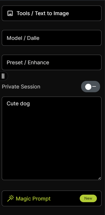 In the "Prompt" text box, enter a detailed description of the image you want to generate. For more information on crafting effective prompts, including the use of magic prompts, style presets, negative prompts, and keywords, please refer to the [prompt-advancement](https://docs.qolaba.ai/extra-resources/prompt-advancement "mention") Guide.