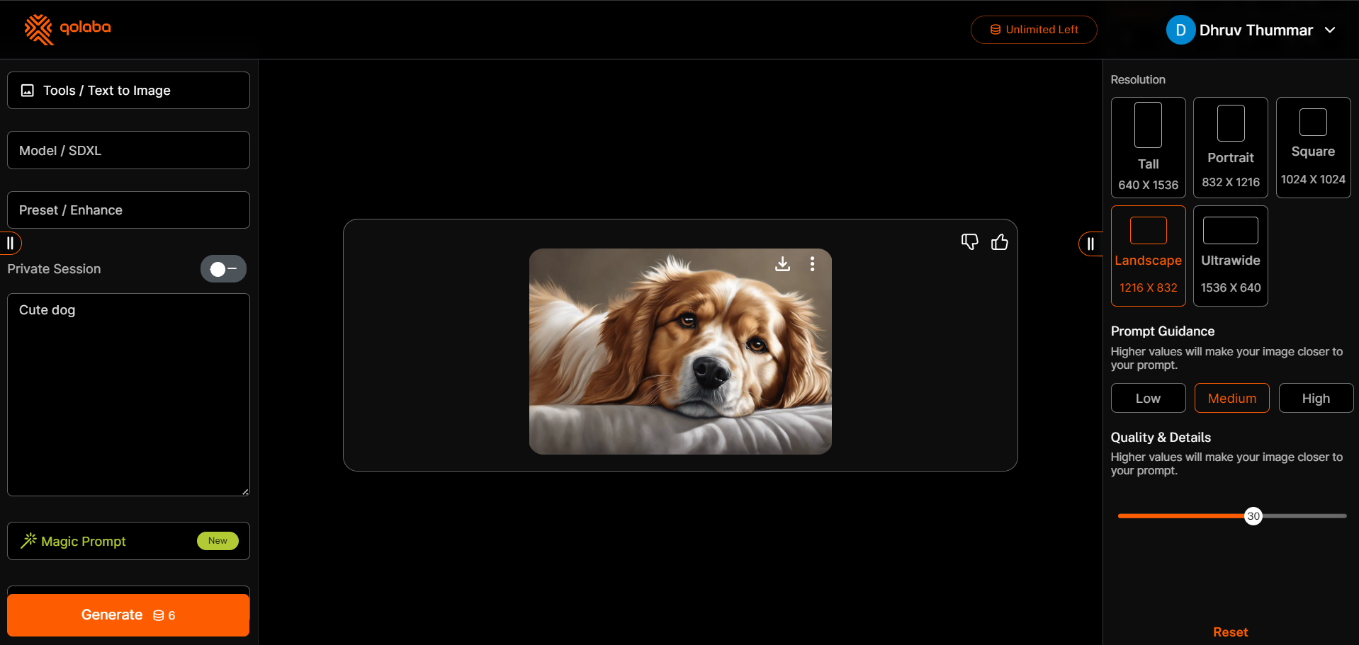Additionally, you can choose the prompt guidance and quality settings. More information on these options can be found in the [generation-settings](https://docs.qolaba.ai/extra-resources/generation-settings "mention") Guide.