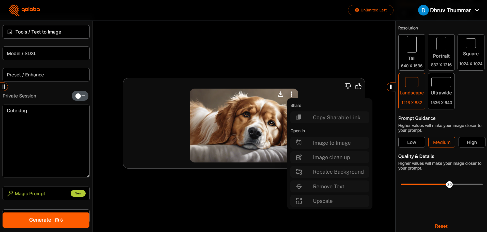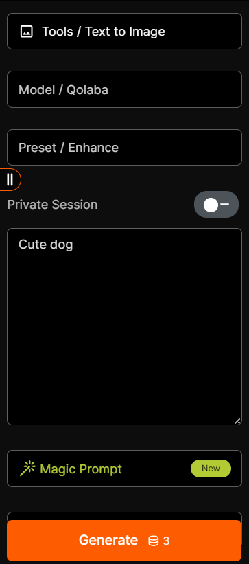 Once you've entered your prompt and selected the desired settings, click the "Generate" button on the left-hand panel. You can choose from three inference types: Normal, Fast, and Hyper. The Normal option is cost-efficient and fast, while the Fast and Hyper options can generate images more quickly but at a higher cost. For more details, please refer to the [generation-settings](https://docs.qolaba.ai/extra-resources/generation-settings "mention") Guide.