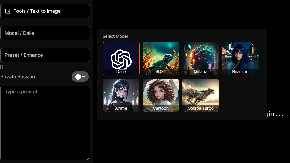 After selecting the model, you can enter your desired prompt or text description in the "Prompt" text box. For more information on crafting effective prompts, including the use of magic prompts, style presets, negative prompts, and keywords, please refer to the [prompt-advancement](https://docs.qolaba.ai/extra-resources/prompt-advancement "mention").